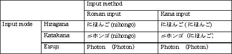 Character types you can use to display phonetic strings are: Hiragana, Katakana, and Eisuji ( English/numeral characters ). The following table shows possible combinations of input methods and input modes and how a phonetic string is displayed when they are selected. Strings in ( ) are the keystrokes from the keyboard.