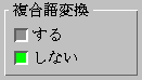 By default, VJE breaks phonetic input strings into bunsetsu and parses for stems, suffixes, and postpositions before converting. When the compound words conversion option is set, VJE attempts to parse phonetics as compound words that have no suffix or postposition. With this option, converting the names of people and places is optimized. In the 複合語変換 box, select する (yes) to set this option and しない (no) to disable it.