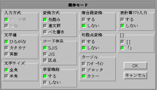 When this option is set, VJE will automatically confirm numerals and operators according to the currently selected character size. Numeral data and formulas can be input more efficiently, because you don't have to convert and confirm numerals and operators. In the 表計算ソフト入力 box, select する (yes) to set this option and しない (no) to disable it.