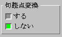 When this option is set, VJE will convert the phonetic string automatically when punctuation symbols (。、!?)are entered from the keyboard. In the 句読点変換 box, select する (yes) to set this option and しない (no) to disable it.