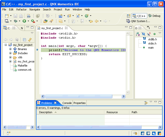 Click Finish. A ready-to-use project structure with a Makefile is created for you, including a small program ("Welcome to the QNX Momentics IDE"), which you'll find in an automatically generated source code file.